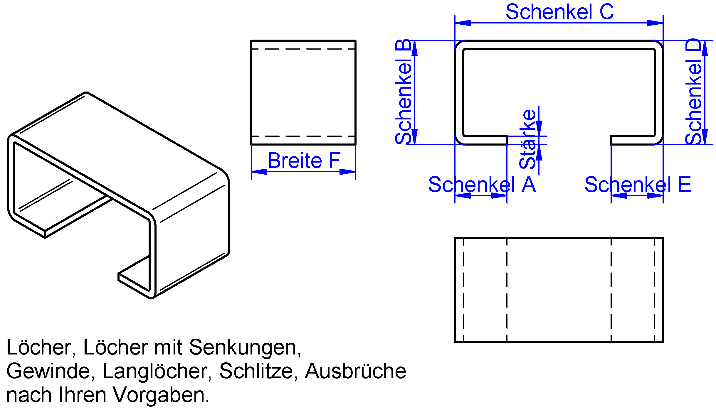 Fertigung von C-Profil aus Stahl, Stahl verzinkt, Edelstahl oder Aluminium nach Ihren Maßvorgaben, Abmessungen ist unsere Stärke. Diese fertigen wir mit Löchern, Löchern mit Senkungen, Gewindelöchern, Langlöchern, Verstärkungssicken auch mit Knotenblechen nach Ihren Vorgaben. Damit wir Ihnen umgehend ein Angebot unterbreiten können, füllen Sie bitte das Kontaktformular weiter unten aus. Die Position der Löcher ist für die Kalkulation nicht notwendig.