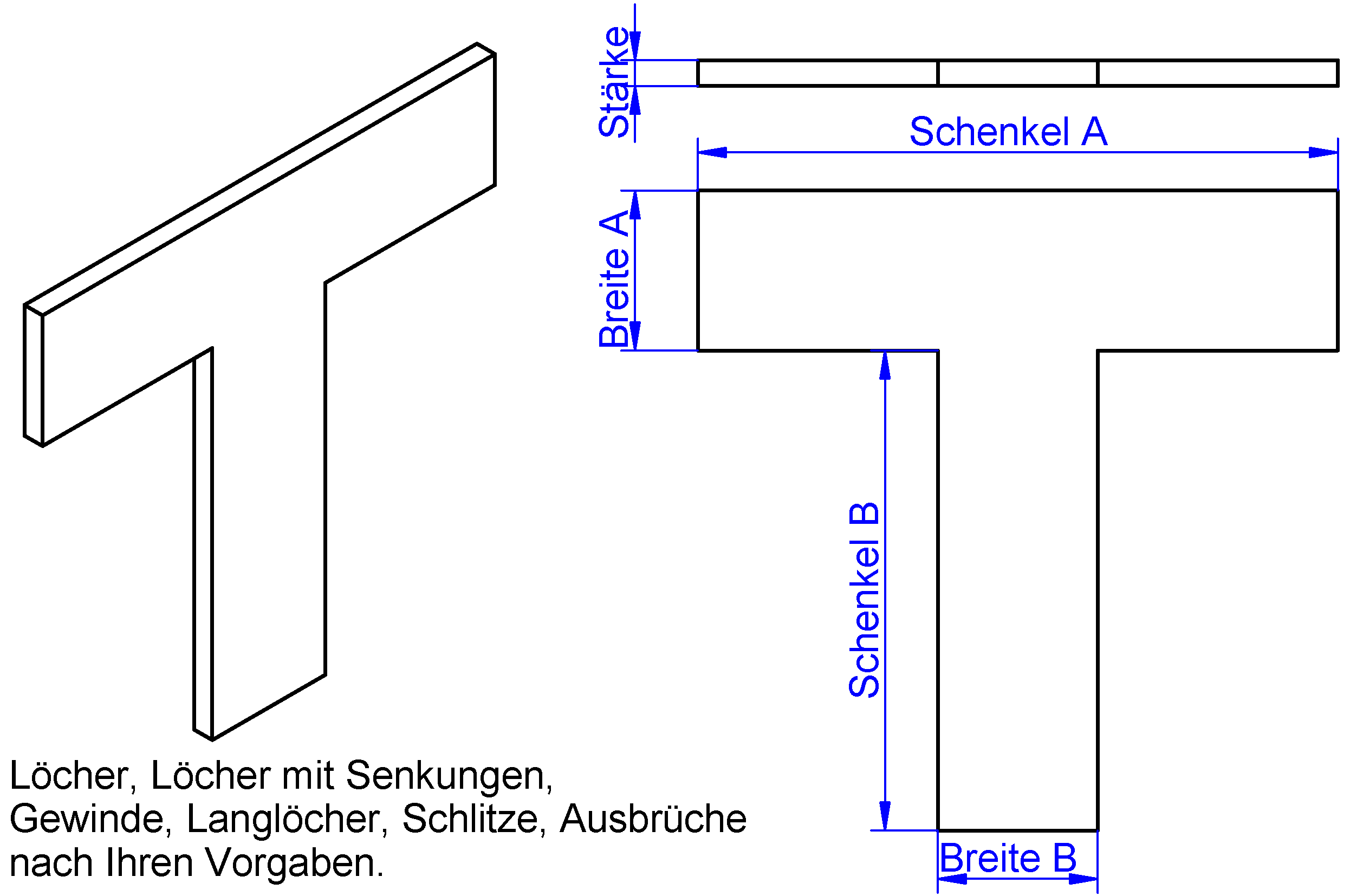 Fertigung von T-Winkel aus Stahl, T-Flachverbinder aus Edelstahl oder T-Form Winkel aus Aluminium nach deinen Maßvorgaben ist unsere Stärke. Diese fertigen wir mit Löchern, Löchern mit Senkungen, Gewindelöchern, Langlöchern nach Ihren Vorgaben. Damit wir dir umgehend ein Angebot unterbreiten können, fülle bitte das Kontaktformular weiter unten aus. Die Position der Löcher ist für die Kalkulation nicht notwendig.