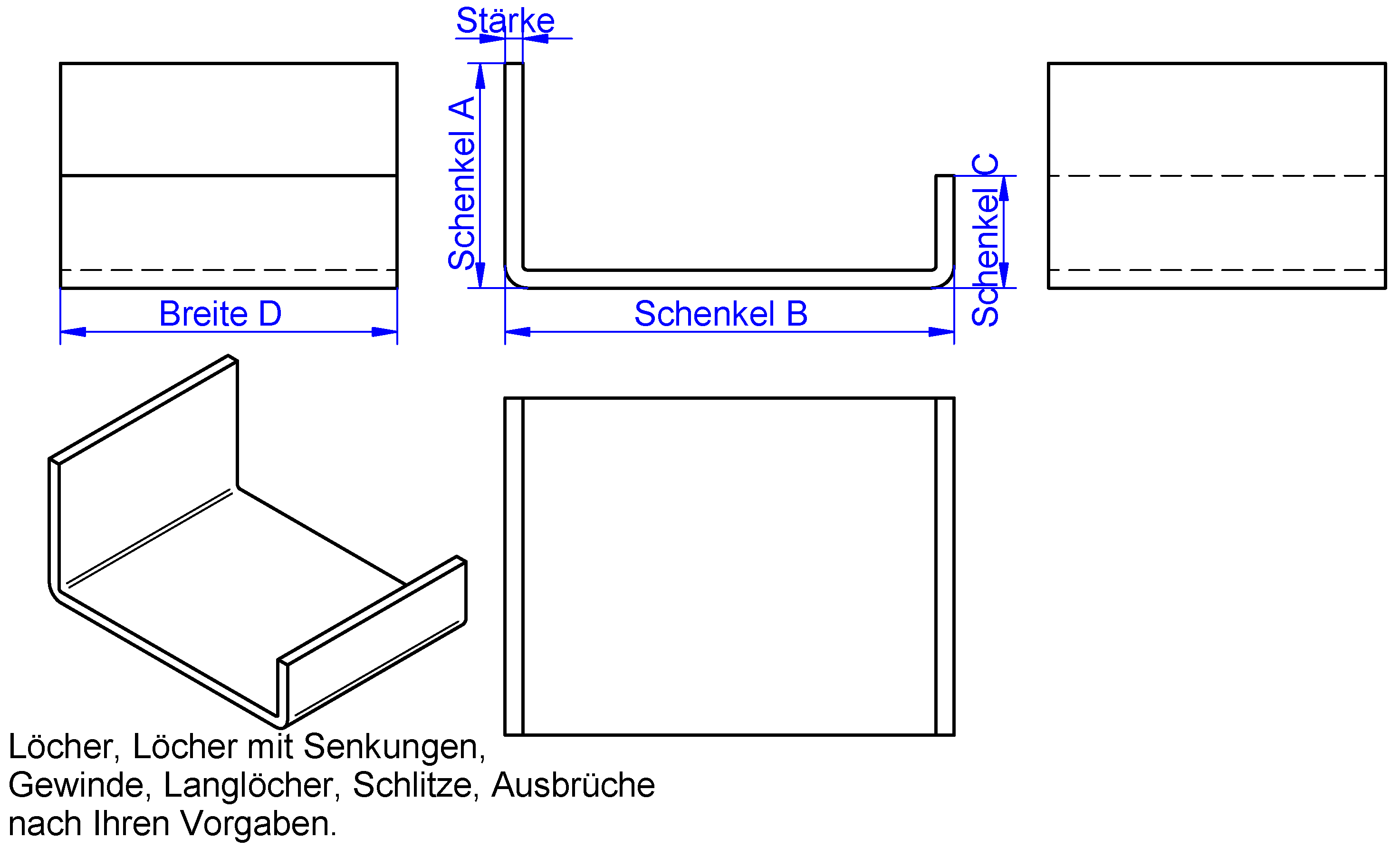 Fertigung von Winkel U-Form, U-Winkel, U-Profil aus Stahl, U-Winkel, U-Profil aus Edelstahl oder U-Winkel, U-Profil aus Aluminium nach deinen Maßvorgaben ist unsere Stärke. Diese fertigen wir mit Löchern, Löchern mit Senkungen, Gewindelöchern, Langlöchern, Verstärkungssicken auch mit Knotenblechen noch Ihren Vorgaben. Damit wir dir umgehend ein Angebot unterbreiten können, fülle bitte das Kontaktformular weiter unten aus. Die Position der Löcher ist für die Kalkulation nicht notwendig.